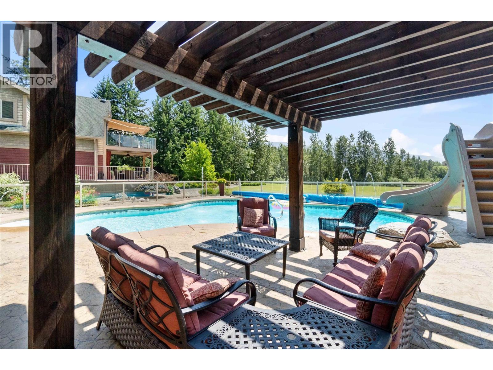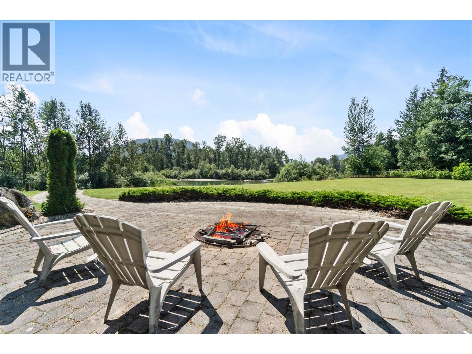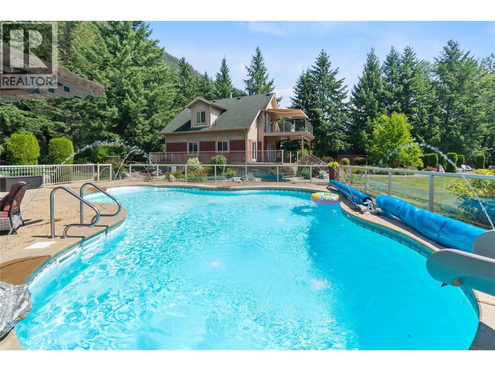 A once-in-a-lifetime turnkey opportunity offering unmatched privacy and recreation—all within town limits. This gated 4-bedroom, 3-bath chalet-style home sits on a beautifully landscaped property with direct river access to Shuswap Lake. Enjoy every outdoor activity from your doorstep—boating, fishing, swimming, ATVing, snowmobiling, walking, and cycling—with a marina and restaurant just down the road. The home features a wraparound concrete deck with glass railing, propane-plumbed BBQ, and both upper and lower-level fire tables. A paving stone patio surrounds a cozy wood-burning fire pit. The detached garage/workshop provides secure indoor parking, while the extensive paved areas offer ample space for vehicles, trailers, and the 30-amp serviced RV site. Relax in the in-ground pool with poolside bar, change room, bathroom, mechanical room, and a hot tub. The grounds are a true showpiece—extensively irrigated and beautifully landscaped with fruit and native trees, plus two matching sheds for additional storage. An incredible opportunity to own a private retreat with all the comforts of in-town living. Call today to book your private tour. (id:4069)